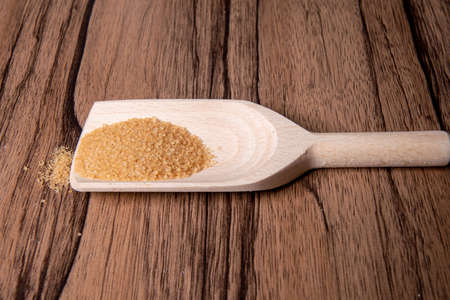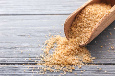Cane sugar in the home kitchen. Sweetener for kitchen dishes on a wooden table. Dark background.