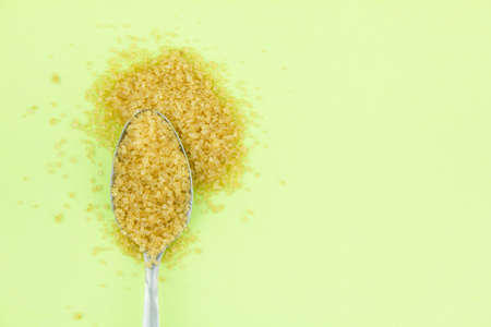 Spoon with brown sugar on green background. Top view. Copy space for text.