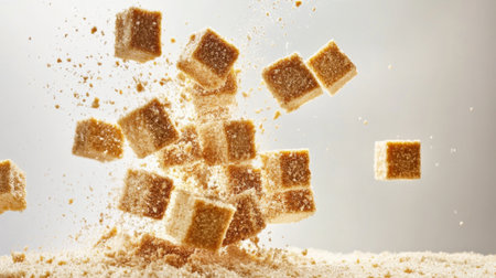 This captivating image showcases a dynamic explosion of brown sugar cubes that highlights their texture and sweetness, ideal for culinary and food-related themes.