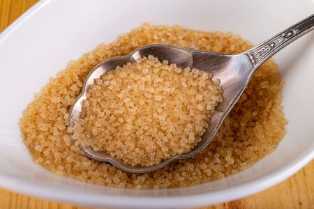 wooden spoon with demerara brown cane sugar close up on pile of sugar