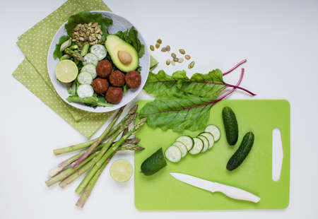Cooking fresh vegetarian bowl with falafel, avocado, cucumber, asparagus, lime, flax and pumpkin seeds and mangold salad leaves on a white background