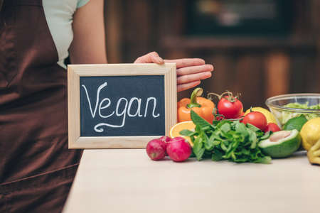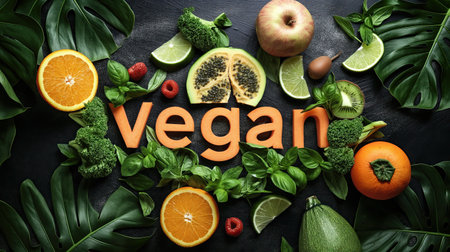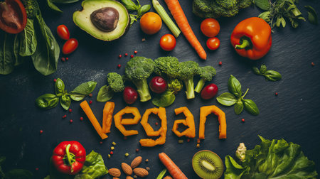Vegan concept with lettering. Variety of fresh organic fruits and vegetables. Vegan food concept
