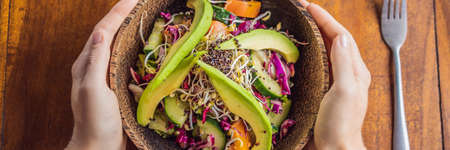 Woman holding bowl with quinoa, avocado and microgreens salad