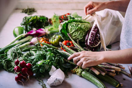 Unpacking a bag of fresh vegetables and greens after grocery shopping. Healthy eating concept.
