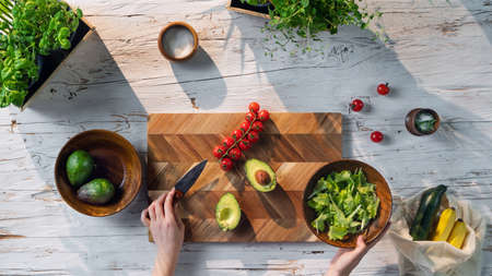 Top view of unrecognizable woman preparing vegetable salad, sustainable lifestyle.