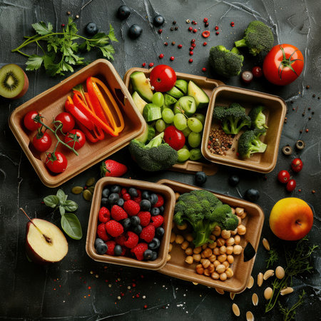 An exquisite arrangement of vibrant fruits, vegetables, and nuts on a dark marble surface, celebrating the joy of healthy eating and natural ingredients, captured from a top-down perspective with