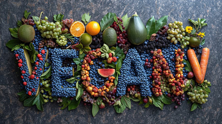 Word Vegan made from fruits and vegetables, top view. Healthy eating concept