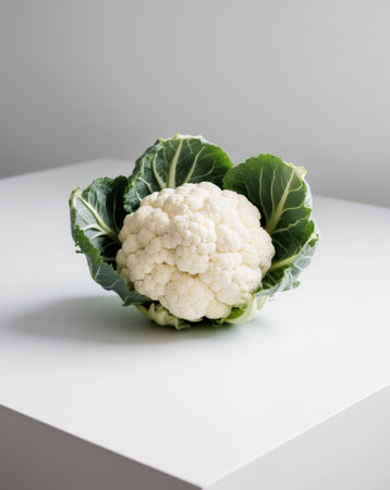 AI Generated. A fresh cauliflower head with green leaves sits on a white surface
