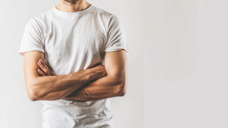 Portrait of man in white t-shirt covering his face with hand over gray wall.