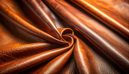 Detailed macro shot of smooth brown leather fabric with natural grains and subtle folds, showing its premium quality and warmth.