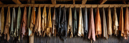 Hides of various colors hang from a wooden structure in a rustic workshop, illustrating the traditional leather crafting process in a warm and inviting setting.