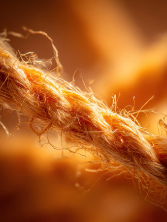 A macro shot reveals the detailed texture of twisted yellow rope, highlighting individual fibers and frayed ends.