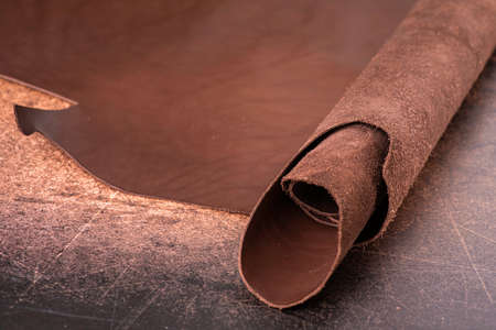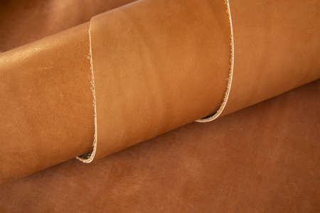 Roll of natural brown leather. Material for manufacture of bags, shoes, clothing and accessories.