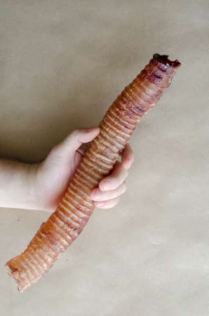 Hand of an adult Caucasian man holds large dried beef trachea. Natural dried dental treats for pets. Encouragement and pampering. Pet supplies. Selective focus.