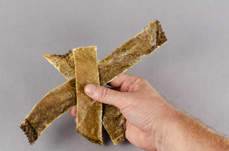 Hand holds dog treats. Dried plates of cows stomach on a gray background. Useful Beef tripe. Close-up. Selective focus.