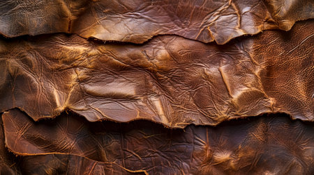 Detailed macro of wrinkled brown leather fabric, showing its rich, textured surface with natural grains and a luxurious finish.