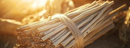 Bundle of twigs tied with twine resting on the ground during golden hour light in a natural setting