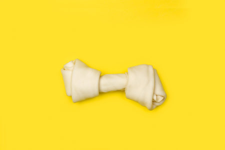 A rawhide bone on a yellow background with copy space