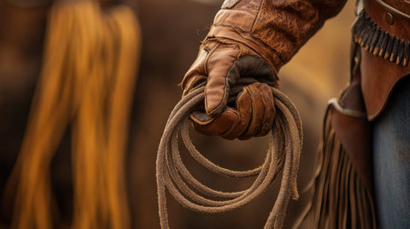 A close-up of a cowgirl's hand holding a coiled lasso, wearing a leather glove with fringe details.