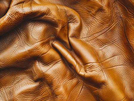 Close-Up of Luxurious Brown Leather Textured Detail, Soft Folds, and Fine Stitching.