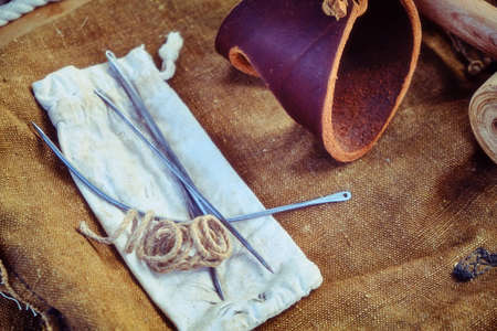 Ship equipment for the needs of sailors on deck.Large thread with needles, leather bracelet sailor vintage style, close-up.