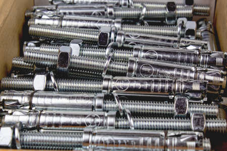view of large galvanized anchor bolts and nuts and fasteners on white background