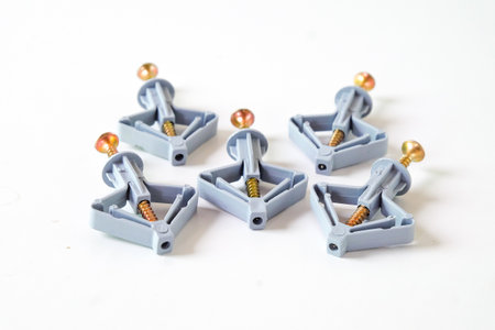 Plastic anchor and bolts on background, construction tool.
