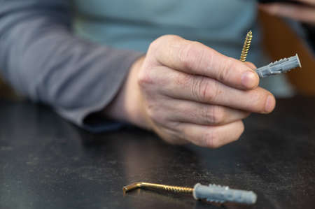 An adult male is holding an L-type screw with a dowel. A screw with a hook is used for mounting on walls, ceilings, and other surfaces. close-up. selective focus.