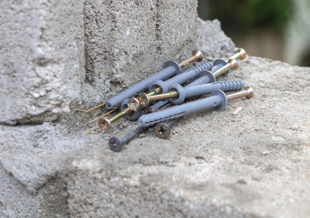 Rawbolts with wall dowels, closeup shot, local focus
