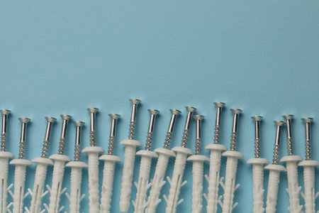 Many metal screws with white dowels on light blue background, flat lay. Space for text