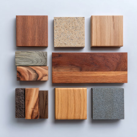 This collection showcases various wooden and stone material samples perfect for interior design or home renovation. Each piece highlights unique textures and colors.