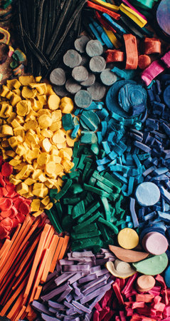 High-angle close-up view of a collection of differently shaped and sized pieces of colorful sculpting material. The various hues and forms create a vibrant visual array.