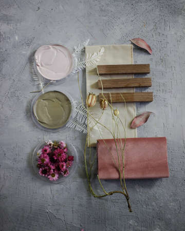 A captivating arrangement of natural elements featuring stones, wood pieces, and fabric samples ideal for interior design inspiration and creative decoration.