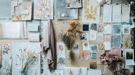 A fusion of pictures and fabrics on a wall creates a stunning collage of art. Electric blue petals, flowers, and paper products add a unique touch to the facade AIG50