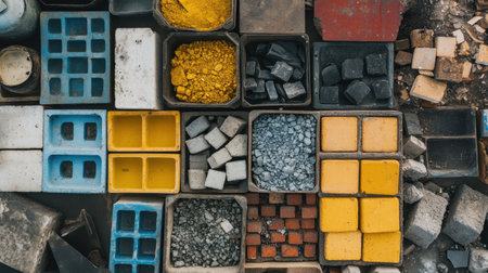 Explore a vibrant array of construction materials neatly arranged in containers, displaying a rich palette of colors, perfect for building and creative projects.