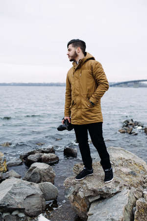 Outdoor portrait of happy young red haired man, wearing pullover and coat, cold foggy day