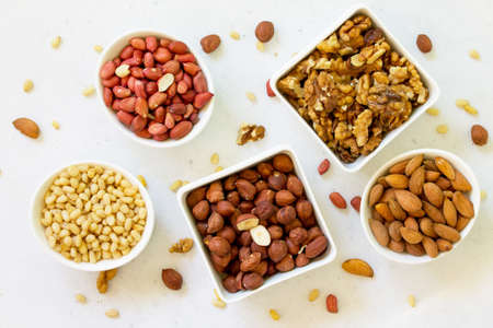 Various nuts in a ceramic bowl (walnut, almonds, pine nuts, hazelnuts) on a light stone table. The concept of a healthy dessert.