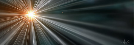 An abstract illustration shows a bright energy burst emitting golden light across a dark blue space. The composition features radial lines and a dynamic visual effect, suggesting movement and cosmic scale. Suitable for various design applications, the image can be used for conceptual or decorative purposes.