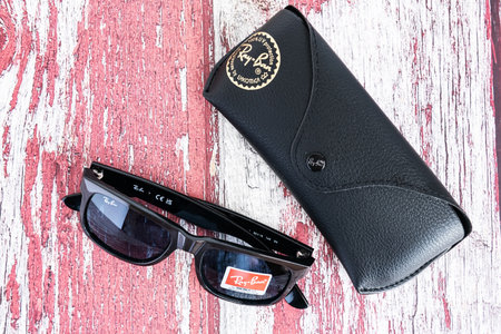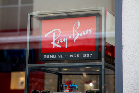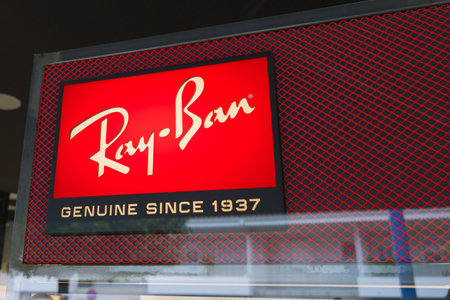 BELGRADE, SERBIA - SEPTEMBER 14, 2018: Ray Ban logo on their main retailer in Belgrade. Ray Ban is an Italian brand of sunglasses and eyeglasses spread worldwide
