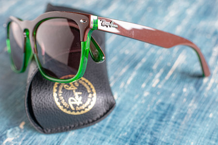 Ray-Ban sunglasses with green frame and case on blue table. Popular and fashionable accessory
