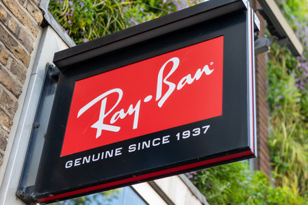 London. UK- 05.17.2023. The Ray-Ban name sign on the facade of its retail store in Covent Garden.