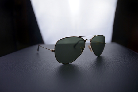 BANGKOK, THAILAND - AUGUST 23, 2016: Details of Ray-Ban Caravan with gold frame and G-15 Lens. Ray-Ban is a brand of sunglasses and eyeglasses founded in 1937 by American company Bausch & Lomb.