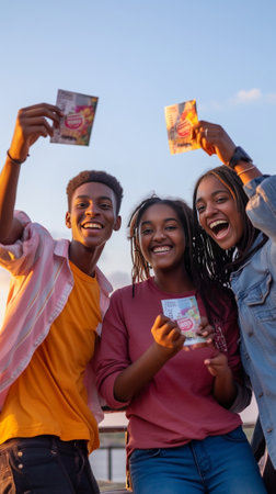 I love studying Cheerful African teenage boy holding books and gesturing while his friends standing on background : Generative AI