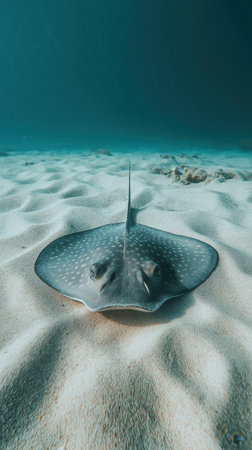 A stunning underwater view captures a stingray resting on the sandy seabed showcasing its unique shape and texture as it blends seamlessly into the serene sea environment