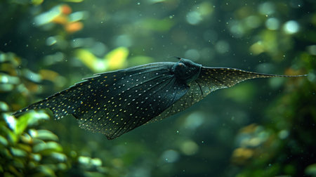 giant freshwater stingray glides gracefully in clear water displaying its broad body and distinctive appearance. This remarkable species captivates with its beauty.