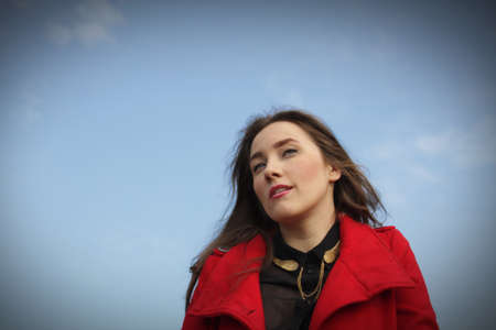 Beautiful girl in a red coat on a blue sky background