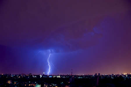 Lightning strike in the sky over the city. Stormy weather
