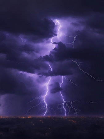 A dramatic lightning storm lights up the night sky with vibrant purples and bright flashes. Dark clouds gather ominously above a silhouetted landscape, creating a striking visual contrast.