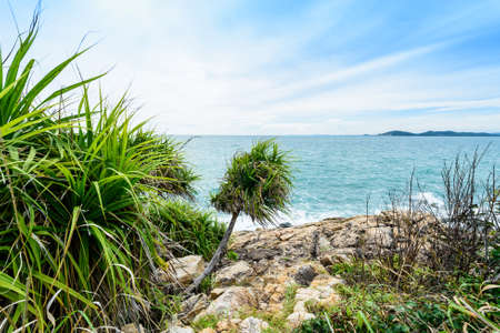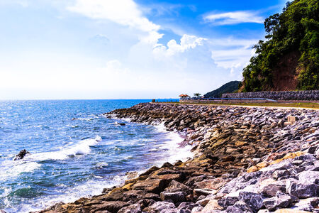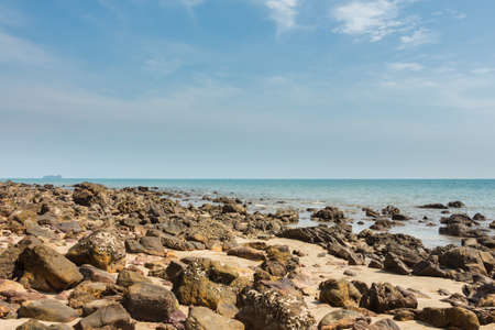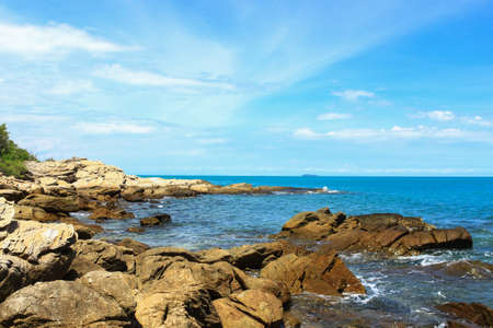 Landscape with rocky on the beach against blue sea and beautiful clouds in the sky