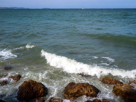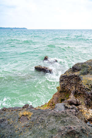 Stormy sea waves beating against rocky coastline- beautiful seascape in Chathaburi, Thailand